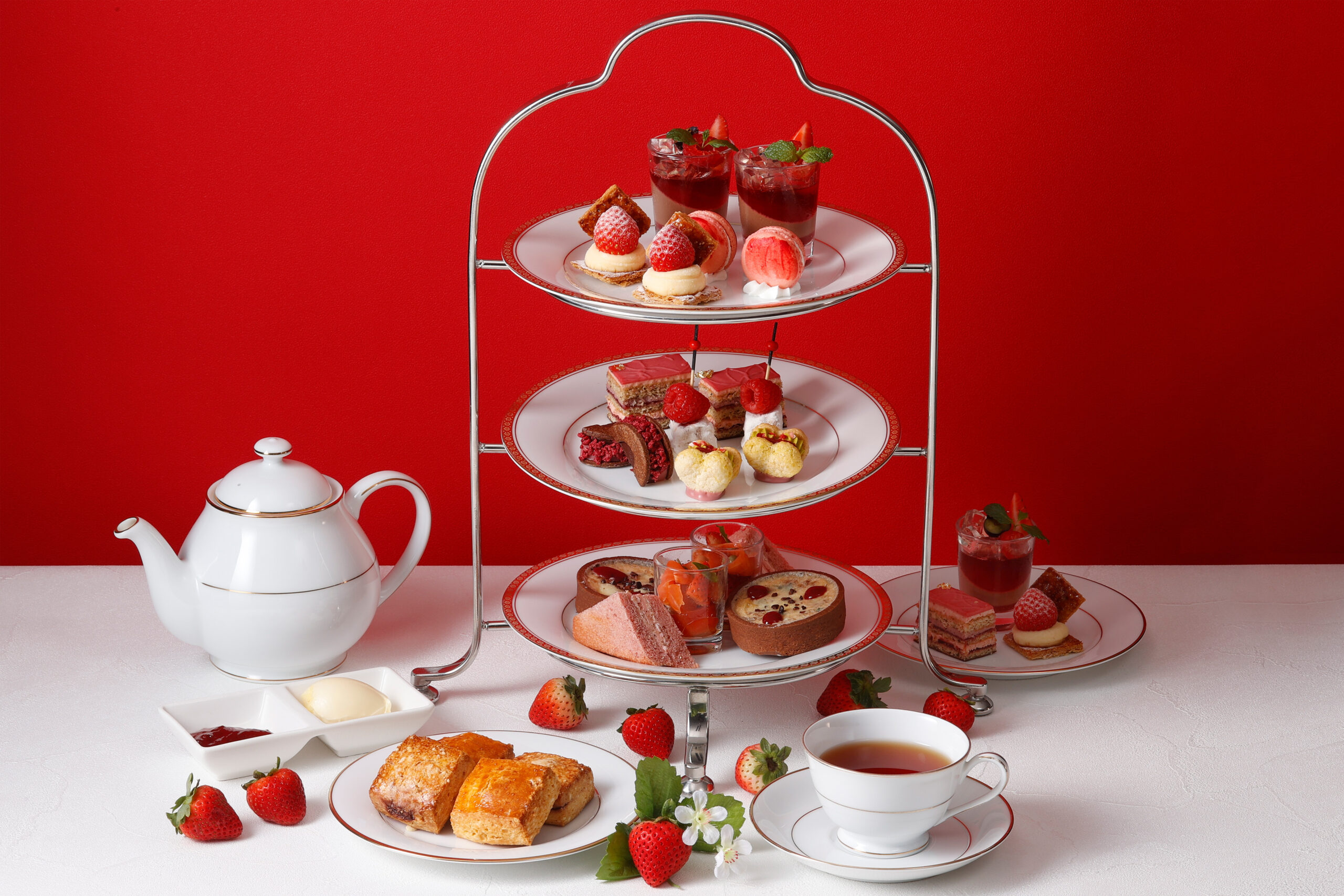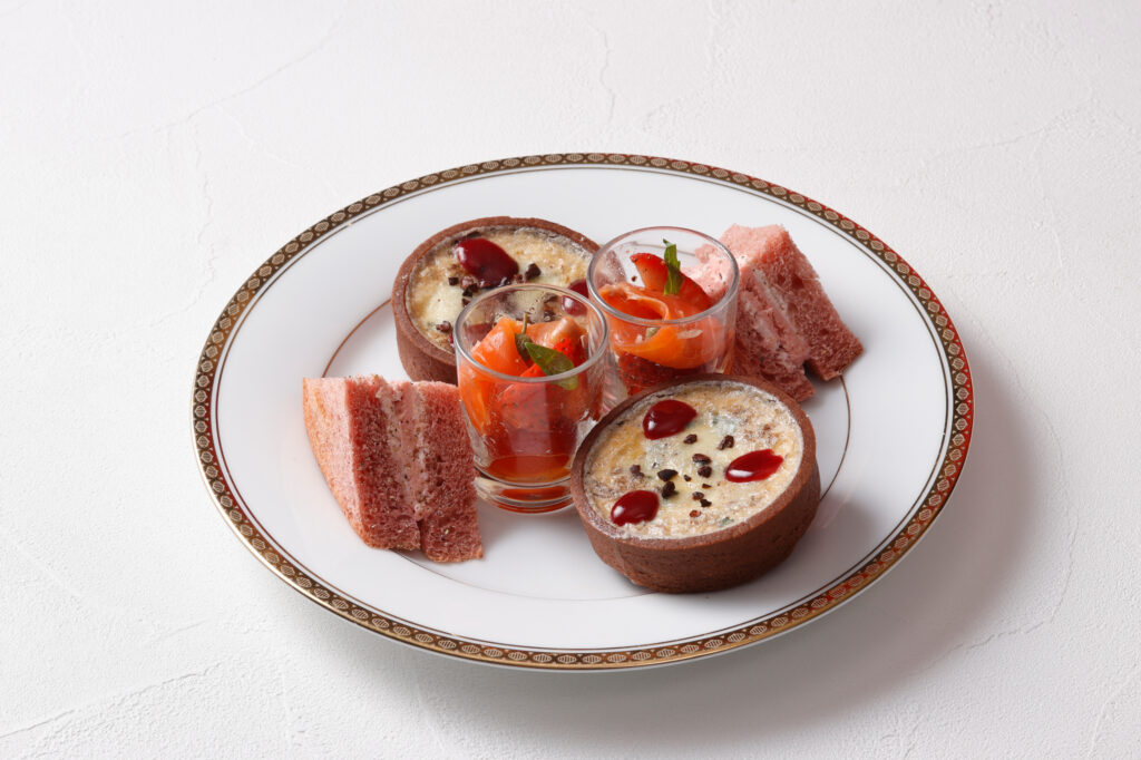 サワークリームと黒胡椒がアクセントの苺とラズベリーのバターサンドや、牛ほほ肉とブルーチーズを使用したキッシュ、苺とスモークサーモンの相性抜群なサラダと、個性豊かなメニューをご用意。甘い香りの苺の魅力をたっぷり詰め込んだ“苺尽くし”のアフタヌーンティーを、ぜひ堪能してみてはいかがだろうか。