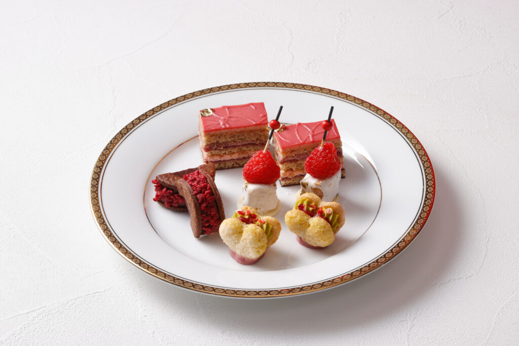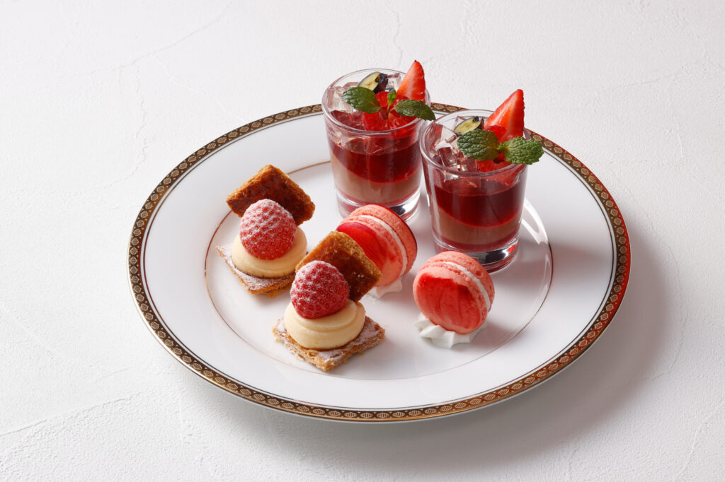 苺とラズベリーのジュレとチョコレートパンナコッタを重ね、エルダーフラワーゼリーをトッピングした真っ赤な苺のヴェリーヌや、苺のバタークリームで仕上げたオペラのほか、苺を丸ごと1粒のせたミルフィーユやヌガーキューブなど、さまざまな苺スイーツを贅沢に味わえる。