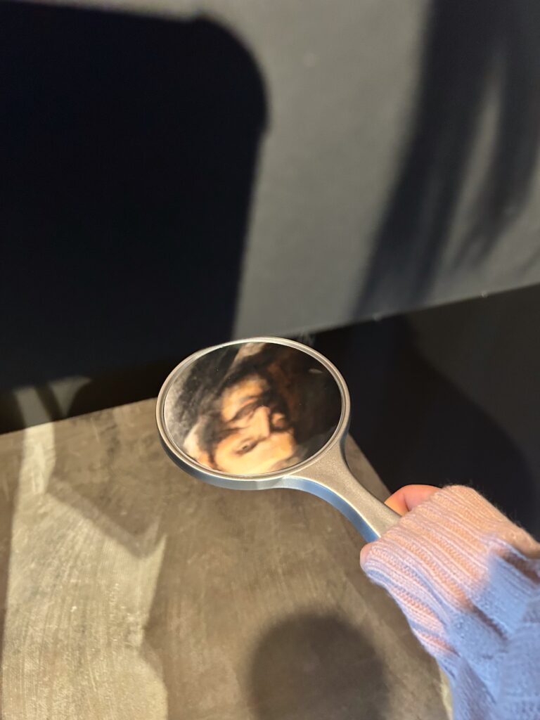 ドキドキしながら鏡を使って絵画を見てみると、アザービジュアルとして注目を集めた不適な笑みを浮かべた男性の絵画が。