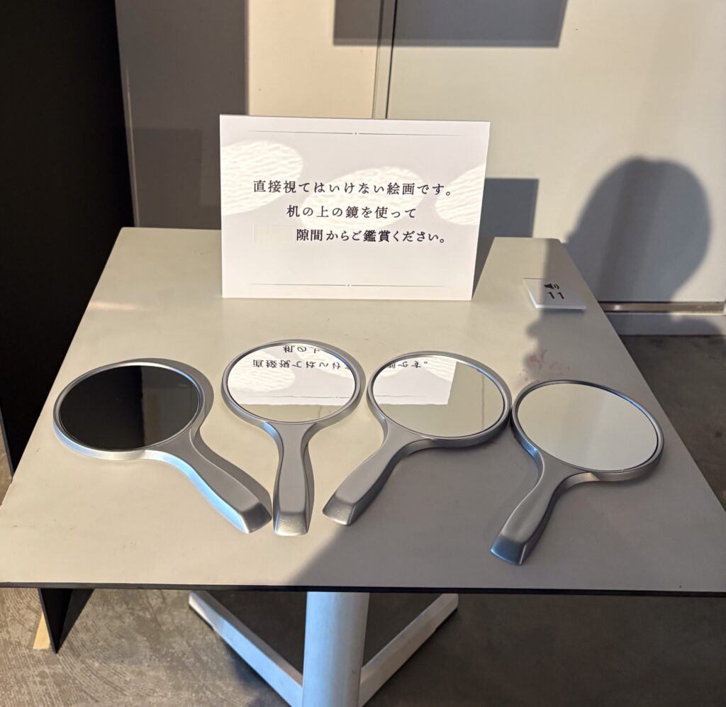 その隣には「直接視てはいけない絵画です。机の上の鏡を使って隙間からご鑑賞ください」と説明された絵画が。