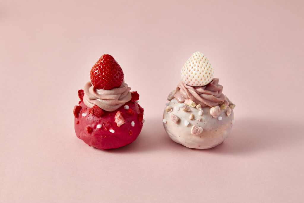 カスタードとストロベリーソースを詰め込んだ、ストロベリーガナッシュで仕上げた2 種のドーナツ。見た目も可愛く、あまおうと淡雪でそれぞれ彩られた1品。